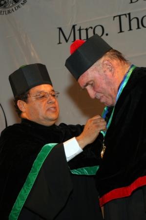 Con la colocación de la toga y el birrete de manos del rector Domínguez Castellanos, la toma de protesta al grado conferido, Thomas Lee, se convirtió en el primer Doctor Honoris Causa de la UNICACH. Acto seguido Fabregas Puig, le entregó un ejemplar del Popol Vuh, simbolizando el “libro de la sabiduría”, a la que se compromete el galardonado.